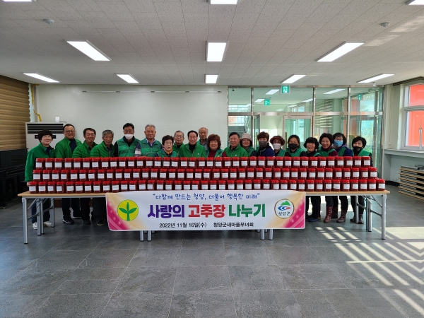 고추장 나눔 봉사는 각 가정에 꼭 필요하지만 직접 고추장을 담지 못하는 어려운 이웃을 위해 새마을운동청양군지회에서 매년 실시하는 활동으로 임천식 지회장, 권영철 군협의회장, 강기자 군부녀회장 및 각 읍·면 협의회장, 부녀회장을 포함한 30명이 함께 참여했다.