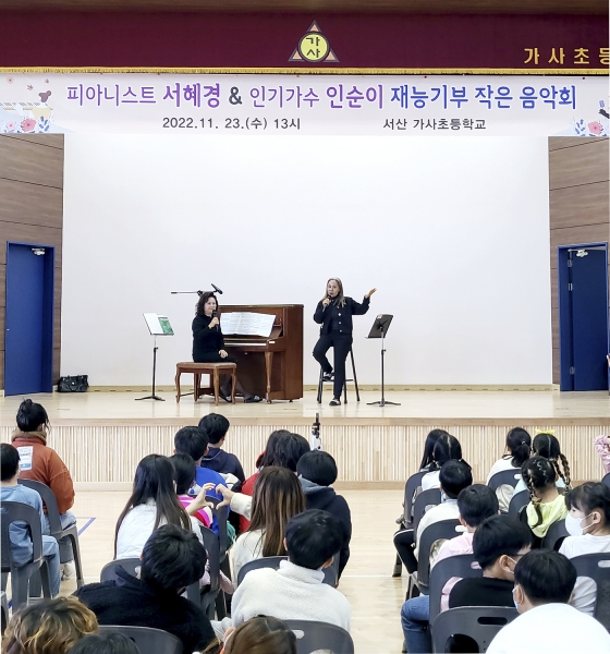 [충청뉴스큐] 충남 서산시는 지난 23일 세계 3대 피아니스트로 명성을 떨쳤던 서혜경 씨와 그의 절친인 국내 최고 가수 인순이 씨가 부석면 가사초등학교를 찾아‘작은음악회’를 열고 재능기부를 통해 학생들에게 꿈과 희망을 선물했다고 밝혔다.