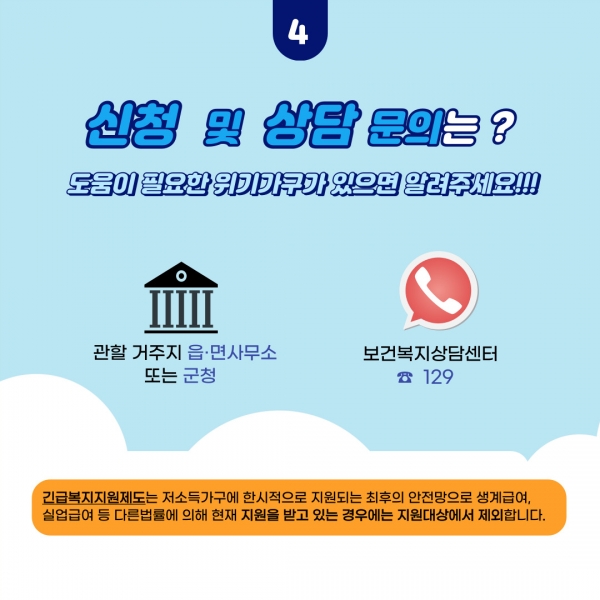 주변에서 위기가구를 발견하는 군민은 보건복지부콜센터나 청양군희망복지지원단, 가까운 읍·면사무소에 제보하면 된다.