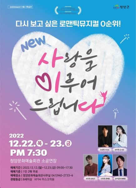 [충청뉴스큐] 청양군이 대학로 인기 뮤지컬 ‘사랑을 이루어 드립니다’ 공연을 앞두고 오는 12일부터 23일까지 관람권 예매를 진행한다.