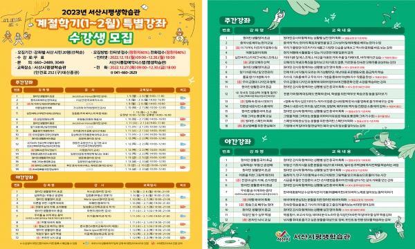 [충청뉴스큐] 충남 서산시는 시민들에게 다양한 학습 욕구 충족과 양질의 학습 기회 제공을 위해 ‘2023년 서산시민대학 계절학기 특별강좌’수강생을 12월 19일부터 30일까지 모집한다고 16일 밝혔다.