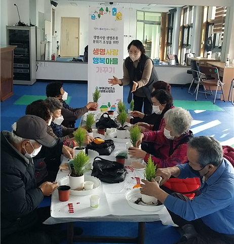 노인 자살예방사업의 일환인 ‘생명사랑 행복마을’은 우울감이 높거나 최근 자살 사고가 발생했던 자살 취약 마을 36개소를 선정, 마음건강 실태조사와 생명사랑교육 및 원예·공예요법 등 우울 감소를 위한 자살예방 프로그램을 운영하는 사업이다.