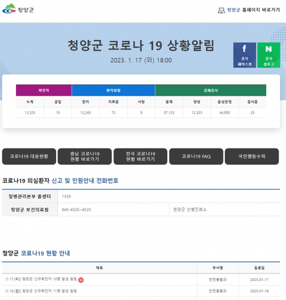 [충청뉴스큐] 청양군이 20일부터 코로나19 확진자 일일 발생 현황 안내 문자 송출을 전면 중단한다.