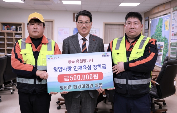 [충청뉴스큐] 청양군 청양읍 소속 환경미화원들이 지난 26일 청양사랑인재육성장학회에 장학금 50만원을 전달했다.
