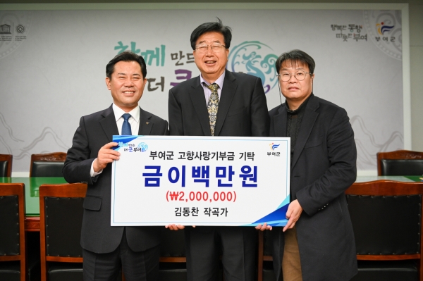 [충청뉴스큐] 부여군은 지난 2일 김동찬 작곡·작사가가 고향사랑기부금 200만원을 기부했다고 밝혔다.