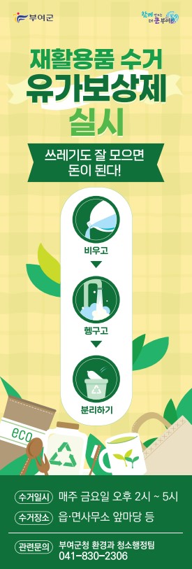 [충청뉴스큐] 부여군이 ‘재활용품 수집 유가보상제’를 매주 금요일 관내 모든 읍·면 행정복지센터에서 확대 시행한다.