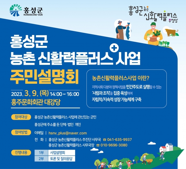 [충청뉴스큐] 홍성군이 살기 좋은 농촌 육성을 위해 추진하는 ‘홍성군 농촌신활력플러스사업’의 주민설명회를 군민과 지역 법인, 단체를 대상으로 오는 3월 9일 오후 2시부터 홍주문화회관 대공연장에서 개최한다.