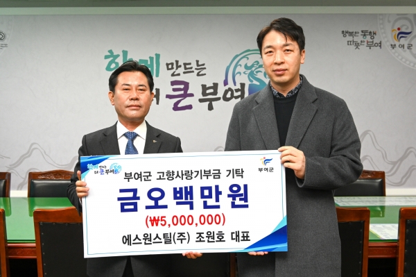 [충청뉴스큐] 최근 에스원스틸 조원호 대표가 부여군에 고향사랑기부금 1년 최고 한도액인 500만원을 기탁했다.