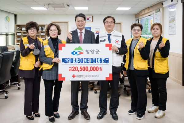 [충청뉴스큐] 청양군과 대한적십자사봉사회 청양지구협의회는 3월 22일 청양군청에서 튀르키예·시리아 지진피해 성금 2,050만원을 대한적십자사에 전달했다.