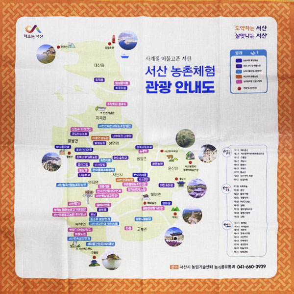 시는 주요 관광지와 농촌체험휴양마을, 체험농장 등 농촌관광자원을 담아 서산 농촌체험관광안내도 손수건을 제작했다고 24일 밝혔다.