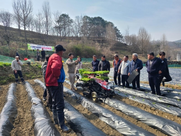 군은 이번 교육을 위해 지난 2월 25일부터 배추 전용 트레이에 모종을 이식하고 로터리와 두둑 작업, 비닐피복 작업까지 미리 준비한 가운데 자동형 및 반자동형 채소 이식기 안전 사용 교육과 작동 시연을 진행했다.