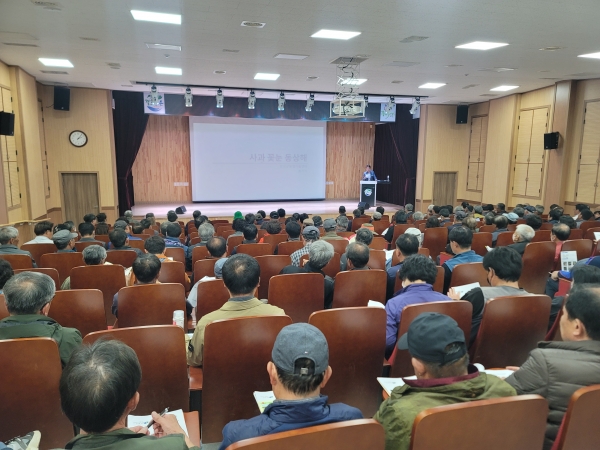 이번 교육은 현재 다양한 사과 적화제가 유통되고 있어 재배품종, 수세, 기상 조건, 약제 살포시기, 약제 희석 비율 등에 따라 효과의 차이가 커 농업인들이 약제별로 사용 시기와 사용 방법에 대해 정확히 이해를 돕기 위해 마련됐다.