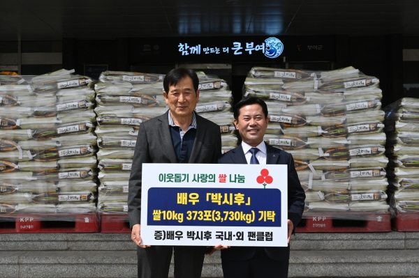 박정현 부여군수는 “부여를 사랑하는 마음을 담아 오랫동안 사랑의 쌀 나눔을 실천해오고 있는 박시후 배우에게 깊은 감사를 전한다”며 인사를 전했다.