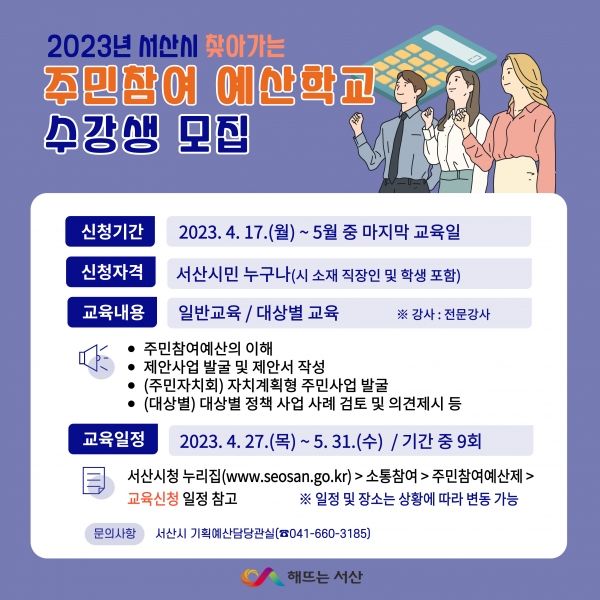 마지막 교육일까지 서산시청 누리집, 기획예산담당관실 또는 행정복지센터 방문을 통해 신청하면 된다.