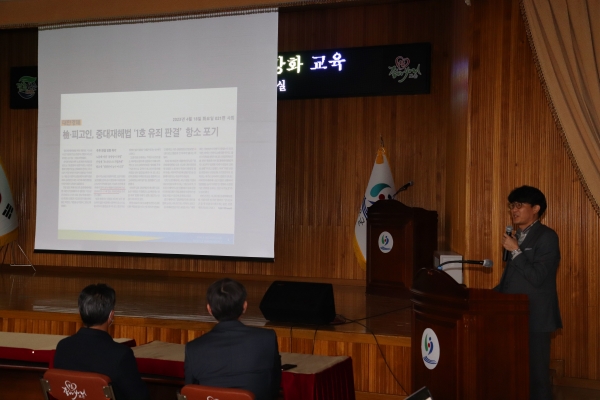 이번 교육은 지난해 1월부터 시행된 중대재해 처벌등에 관한 법률에 따라 공직자들의 안전의식을 높이고 중대재해 발생시 대응 및 예방요령을 숙지하기 위해 마련됐다.