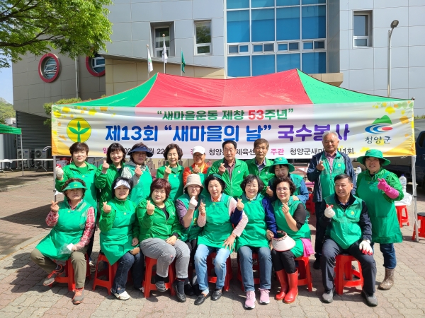 [충청뉴스큐] 새마을운동 청양군지회가 지난 22일 청양읍 소재 문화체육센터 주차장에서 새마을의 날 53주년을 기념한 사랑의 국수 봉사를 전개했다.