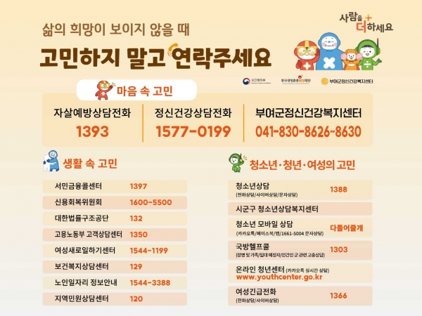 이에 군 정신건강복지센터는 자살빈발지역에 자살예방상담전화번호 안내 현수막을 게시하고 방문자 수가 많은 병원, 약국, 마트 등에 포스터를 붙이는 등 다양한 방법을 활용해 도움정보기관을 홍보하고 있다.