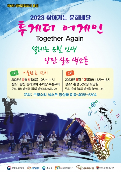 [충청뉴스큐] 홍성군문화도시센터의 ‘2023년 찾아가는 문화배달’지원사업에 선정된 은빛소리색소폰앙상블의‘투게더 어게인-설레는 은빛 인생, 낭만 실은 색소폰’공연이 5월 6일 오전 10시에 광천감리교회 주차장 특설무대에서 개최된다.