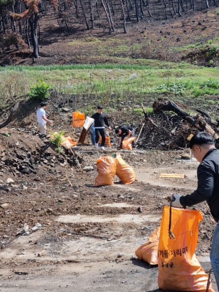 이날 농촌 일손돕기에 참여한 직원은 15명으로 당면한 업무를 잠시 미루고 산불 피해로 전소된 주택 철거로 인해 발생한 잔해 및 주변 쓰레기 수거 등 환경정비 작업에 힘을 보탰다.