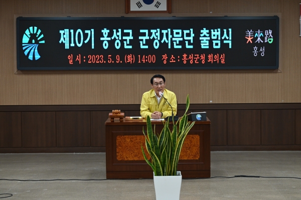 [충청뉴스큐] 홍성군은 9일 군청 회의실에서 민선8기 홍성군정의 핵심 역할을 담당할 ‘제10기 홍성군 군정자문단 출범식’을 개최했다 군정자문단은 홍성군의 정책과제를 검토하고 전략적인 방향성을 제시하는 역할을 수행하며 향후 2년간 군정발전을 위한 다양한 분야에서의 전문적인 지식과 아이디어를 제공함으로써 군 정책 수립에 큰 도움이 될 것으로 예상된다.