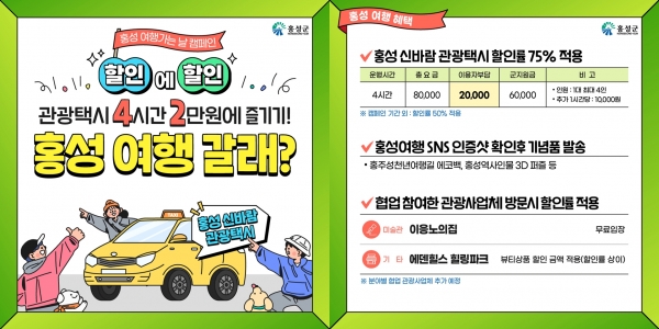 이를 위해 군은 먼저 캠페인 기간 중 모든 관광객에게 기존 4시간에 4만원으로 운영하던 ‘홍성군 신바람 관광택시’를 대폭 추가 할인해 4시간에 2만원으로 이용할 수 있게 된다.