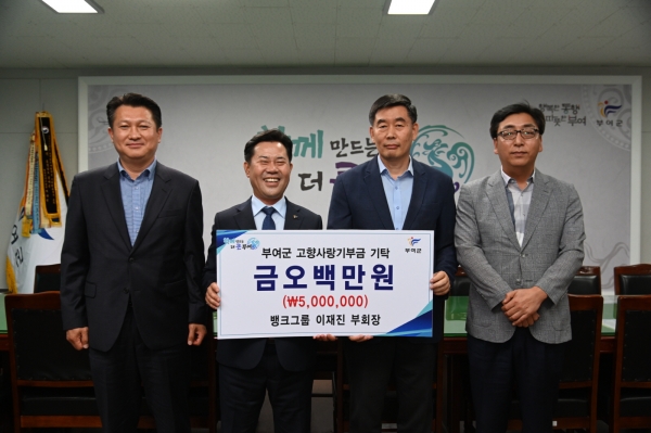 지난 18일 뱅크그룹 이재진 부회장이 부여군에 고향사랑기부금 1년 최대 한도액인 500만원을 고향발전을 위해 흔쾌히 기부했다.