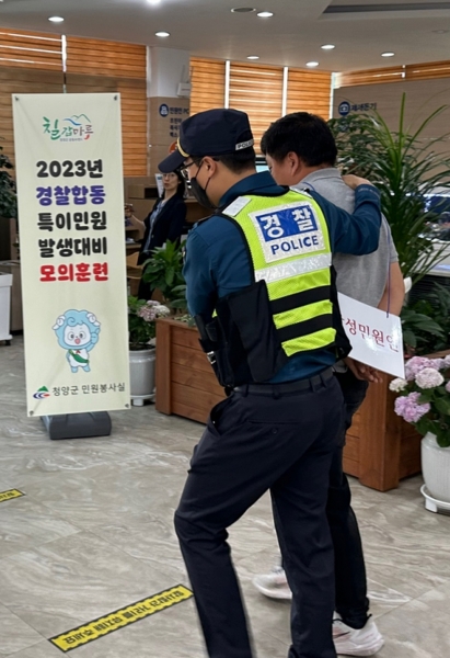 [충청뉴스큐] 청양군이 지난 23일 청양경찰서와 함께 민원 공무원을 대상으로 증가 추세를 보이는 폭언·폭행, 기물파손, 업무방해 등 특이 민원인에 대한 대응훈련을 가졌다.