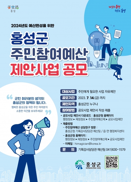 [충청뉴스큐] 홍성군은 예산편성 과정에 주민의 참여기회를 보장하고 재정 운영의 투명성과 공정성을 높이기 위해 2024년 예산편성을 위한 주민참여예산 제안사업 공모를 실시한다.