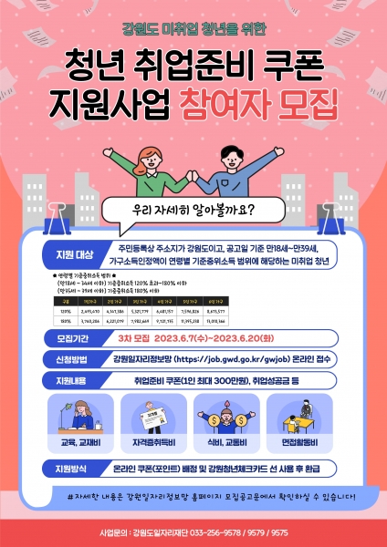 [충청뉴스큐] 강원도와 강원도일자리재단은 도내 만18세~만39세 미취업 청년들의 안정적인 구직활동 지원을 위해 6월 7일부터 2주간‘청년 취업준비 쿠폰 지원사업’의 3차 참여자를 모집한다.