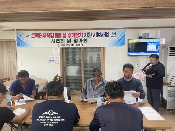 이날 회인면 부수리 배추 재배농가에서 트랙터 부착형 폐비닐 수거기 시연을 진행하고 해당 시범사업의 효과 및 개선방안에 대한 토의 시간을 가졌다.