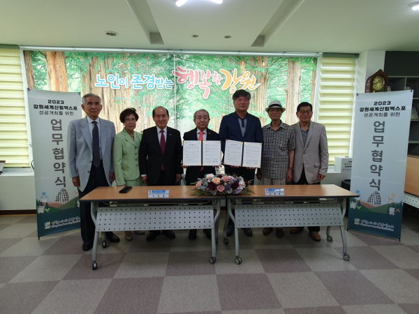[충청뉴스큐] 강원세계산림엑스포 조직위원회는 ‘2023 강원세계산림엑스포’ 성공 개최를 위해 6월 13일 오후 2시 30분 강원노인복지회관에서 대한노인회 강원특별자치도연합회와 업무협약을 체결했다.