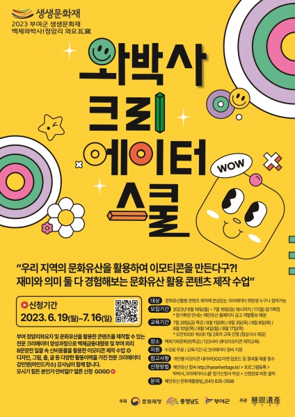 와박사 크리에이터 스쿨은 금동대향로 및 백제 8문양전 속 신비동물을 활용한 이모티콘 기획 및 캐릭터 디자인, 이모티콘 플랫폼 제안하기 등으로 교육이 구성되어 있다.