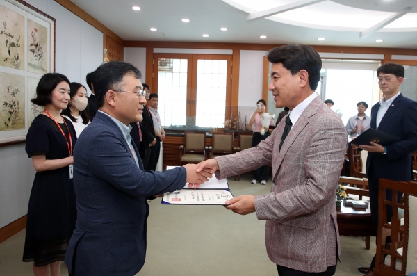[충청뉴스큐] 김진태 강원특별자치도지사는 7. 17. 오후 2시 30분 도청 통상상담실에서 2023년 상반기 모범공무원에게 국무총리 표창을 전수했다.
