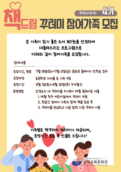 ‘책드림 꾸러미’는 초등학생 자녀를 둔 가족을 대상으로 맞춤형 책 꾸러미를 한 달간 대출해주는 프로그램으로 7월 18일부터 21일까지 삼척교육문화관 홈페이지를 통해 신청받아 선착순 4팀을 모집한다.