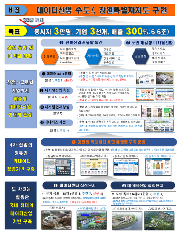 강원특별자치도는 지난 2월 ‘데이터산업 수도 강원특별자치도 구현’이라는 비전과 ‘2033년까지 현재보다 3배 성장된 디지털 종사자 3만명, 디지털기업 3천개, 매출 300%성장’이라는“333 프로젝트”를 목표로 설정했다.