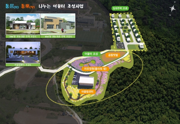 먼저 어울림센터는 연면적 400㎡에 주민교육실 1실, 치유원예 체험실, 나눔주방 등을 갖추고 있으며 이곳에는 주거 정착유도 프로그램, 소득증대 유도 프로그램, 선주민과의 화합 프로그램 등을 운영해 귀농·귀촌인의 유입 및 원주민과의 화합을 도모할 예정이다.