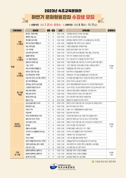 수강생 모집 기간은 7월 27일부터 8월 8일까지이고 속초교육문화관 홈페이지에서 수강 신청이 가능하며 선착순으로 모집한다.