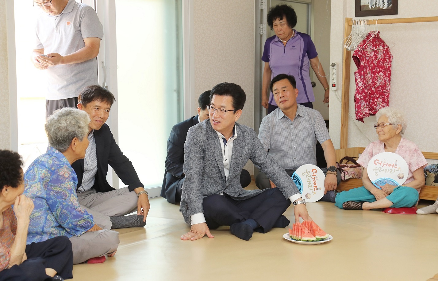 [충청뉴스큐]허태정 대전광역시장이 24일 오후 대덕구 신탄진 경로당에 마련된 무더위 쉼터를 방문해 어르신들의 안부를 확인하고 애로사항을 청취하고 있다.