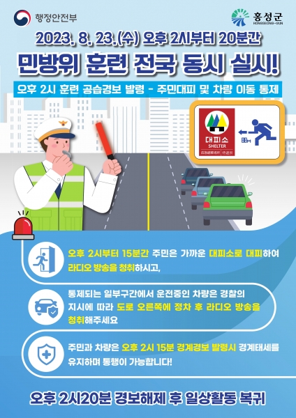 [충청뉴스큐] 홍성군은 8월 21일부터 24일까지 실시하는 2023년 을지연습과 연계해 오는 23일 오후 2시부터 20분간 공습대비 민방위 훈련을 실시한다고 밝혔다.