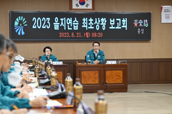[충청뉴스큐] 홍성군은 21일 군청 회의실에서 이용록 군수 주재로 간부공무원 20여명이 참석한 가운데 ‘2023년 을지연습 최초상황보고회’를 개최했다.