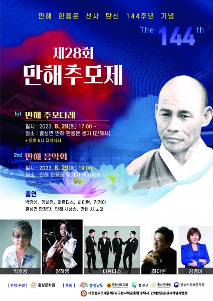 홍성문화원이 매년 개최하고 있는 만해 추모 다례 및 만해 음악회는 만해 탄신 144주년을 맞아 만해 한용운선사의 나라사랑 정신과 문학세계를 계승 발전시키기 위해 개최된다.
