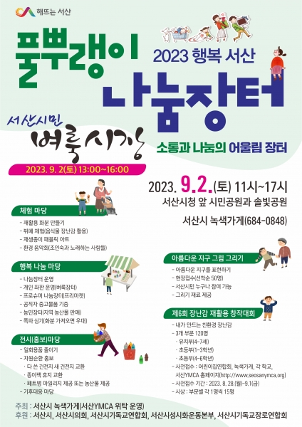 [충청뉴스큐] 충남 서산시는 9월 2일 서산시청 앞 솔빛공원과 시민공원에서 자원순환의 날을 기념한 ‘풀뿌랭이 나눔장터’가 열린다고 밝혔다.