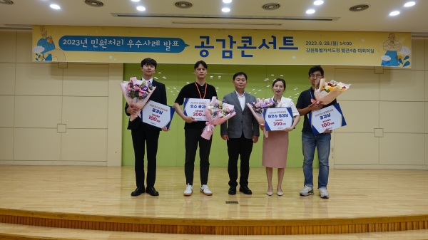 강원특별자치도 치수과는 ‘도민 중심 맞춤형 폐천관리 일괄행정서비스’로 우수상과 상금 200만원을 수상했으며 삼척시의 ‘덕분에 우리 땅을 지켰습니다’와 화천군의 ‘주민 눈높이에 맞는 산림소득 보조사업 개선’은 각각 공감상에 선정되어 상금 100만원을 수상했다.