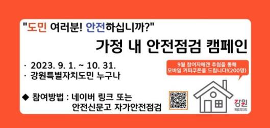 [충청뉴스큐] 강원특별자치도는 생활 속 재난을 예방하기 위해 9월 1일부터 10월 31일까지 가정 내 안전점검 2차 캠페인을 실시한다.