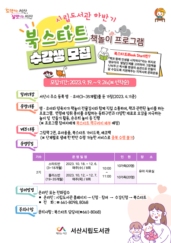 [충청뉴스큐] 충남 서산시는 서산시립도서관에서 10월부터 12월까지 진행되는 ‘2023년 하반기 북스타트 책놀이프로그램’ 수강생을 19일부터 26일까지 선착순으로 모집한다고 밝혔다.