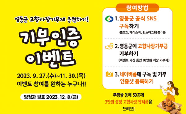 ‘영동군 고향사랑사랑기부제 기부인증 이벤트’는 지난달 27일부터 오는 11월 30일까지 두달 간 진행된다.