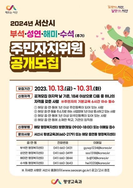 시에 따르면 모집 대상은 올해 말 임기 만료 예정인 부석면, 성연면, 해미면 제3기 주민자치회 위원이며 모집 시 결원이 생긴 수석동 제2기 위원의 충원도 함께 진행될 예정이다.
