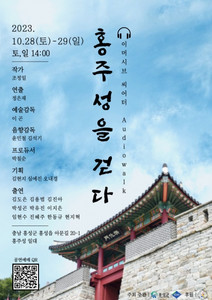 [충청뉴스큐] 홍성군은 청운대학교 산학협력단과 연극예술학과와 협력해 제작한 관객 몰입형 연극 ‘Audio Walk, 홍주성을 걷다’를 오는 10월 28일 29일 오후 2시 홍주읍성 일원에서 선보인다고 밝혔다.