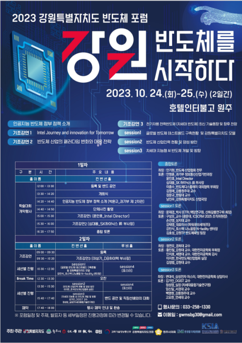 [충청뉴스큐] 강원특별자치도는 원주시, 강원일보와 공동으로 오는 10월 24일부터 25일까지 ‘2023 강원특별자치도 반도체 포럼’을 개최한다.