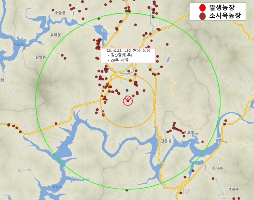 [충청뉴스큐] 강원특별자치도는 양구군 소재 한우농가에서 수의사 진료 중 1마리가 고열, 피부결절 등 의심 증상을 보여 신고했고 관할 동물위생시험소 가축방역관을 현장에 파견 시료를 채취해 농림축산검역본부에 정밀검사를 의뢰한 결과, 10월 24일 오후 1시 최종 림피스킨병으로 확진됐다고 밝혔다.